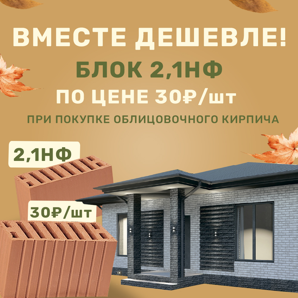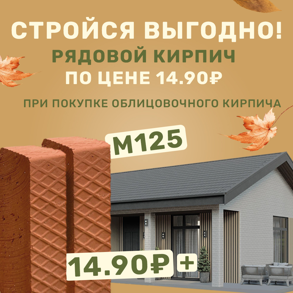 Теперь при покупке облицовочного кирпича вы можете приобрести рядовой кирпич по специальной цене - 14,90₽!